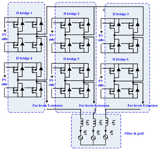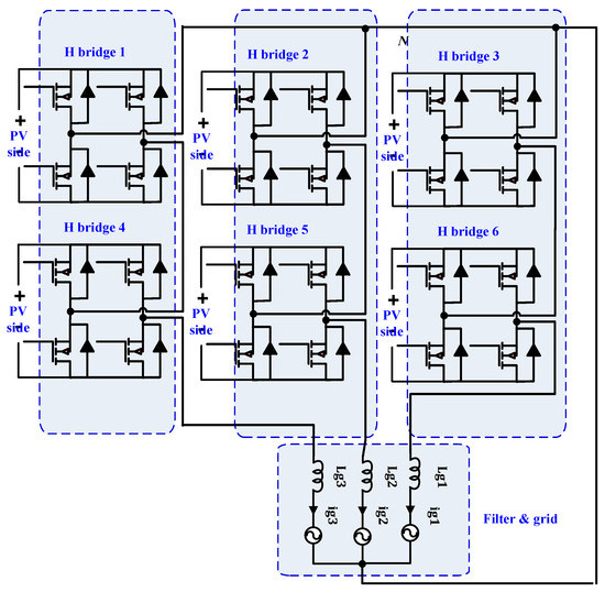 - Rivera, S.; Wu, B.; Kouro, S.; Wang, H.; Zhang, D. Cascaded H-bridge multilevel converter topology and three-phase balance control for large scale photovoltaic systems. In Proceedings of the 2012 3rd IEEE International Symposium on Power Electronics for Distributed Generation Systems (PEDG), Aalborg, Denmark, 25–28 June 2012; pp. 690–697. [Google Scholar]