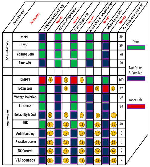 To summarize the features mentioned above for three-phase microinverters, they are classified into mandatory and important features, as illustrated in Figure 5. Mandatory features include MPPT operation, CMV, four-wire system, and high voltage gain. These features should be pointed out in the first steps of the microinverter design. In the second step of design, other important features such as electrolyte-less capacitor, isolation using HFL transformer, DMPPT, THD, EMI, efficiency, and power quality issues should be optimized for the adequate performance of three-phase microinverters.