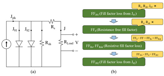 (a) Equivalent circuit of solar cells with double-diode model, and (b) process of fill factor loss analysis.