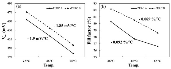Temperature coefficient of (a) Voc and (b) fill factor.