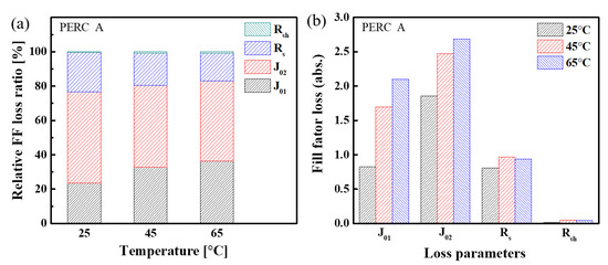 Fill factor loss analysis results of PERC A: (a) Normalized fill factor ratio; (b) Absolute fill factor loss.