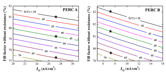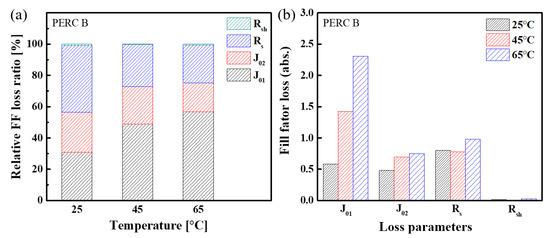 In addition, the temperature dependence of FFJ02 for the PERC B cell (Figure 6b) reveals that the FFJ02 will not increase significantly at elevated temperature if the initial ratio to the total fill factor loss is relatively small. On the other hand, the difference of FFJ01 between 25 °C and 65 °C increased up to 20%, even though the initial difference was only 7%. This means that the effect of J01 on fill factor will be accelerated if the initial loss is relatively high.