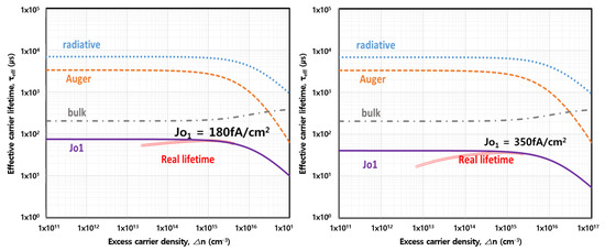 In order to verify the results of the fill factor loss analysis, the lifetime was measured through Sinton instrument’s Suns-Voc equipment at 25 °C. The recombination current density of the samples was evaluated by using a lifetime fitting method. Through the specific resistance and thickness of the wafer, the Auger recombination and the radiative recombination are represented as lifetime according to the excess carrier concentration as graphs in Figure 7 show.
