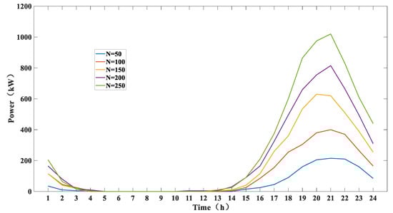- The random charging load model of EVs is established according to the daily travel habits of residents. The influence of the EVs’ number and charging power on the charging load is analyzed. It is confirmed that large-scale EV use with random charging will produce a serious charging load, which will influence the safe operation of the power grid.