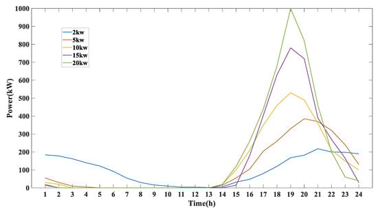 The effects of load regulation are obviously improved as shown in Figure 15 when group A and group B EVs participate. Group A and Group B EVs can discharge more power if the load is high and discharge less or no power if the power load is low. When the permeability reaches 100%, the peak load decreases by 14.25%, and the peak load becomes more stable.