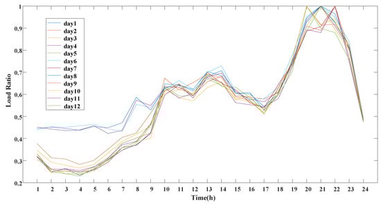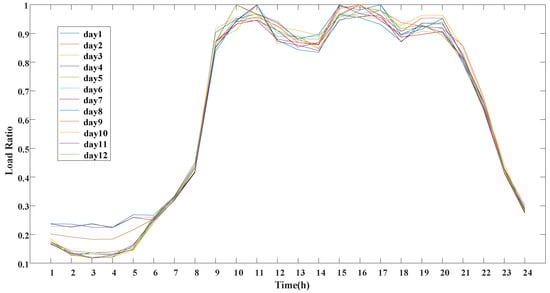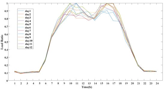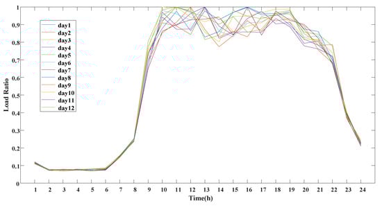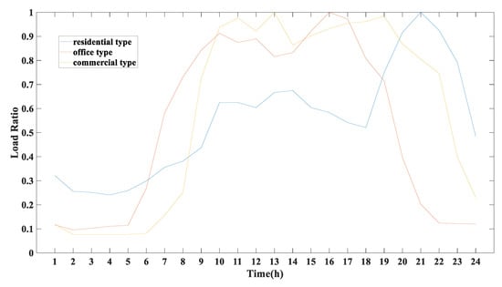 Figure 4 shows the load ratio curves at different times for the residential type of building. In the residential type, the load increases significantly from 8:00 a.m., with the peak occurring between 19:00 and 23:00 a.m. This is closely related to residents’ living habits. Residents start a new day after waking up at about 8:00 am. Most people will leave home to work during the daytime, but some unemployed residents stay at home for their own business during the daytime on the power load remains at a low level before the other residents come back. Residents will return to the home after work at about 18:00. Then, the demand for electricity will increase. There will then be a peak of electricity consumption until the residents rest at night.
