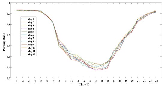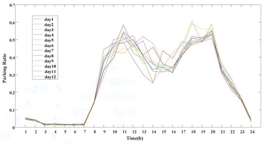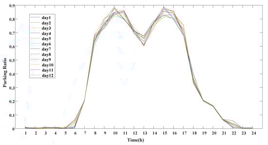 Figure 9 is a typical residential type parking ratio curve. The parking ratio of residential type buildings mainly depends on the habits of residents. Some residents drive to work during the day. After work, these residents drive home. Therefore, the probability of parking during the day is relatively low, while the ratio of parking at night is higher. Some families have more than one car, and some cars are used for other temporary trips besides work. These cars will be parked in the garage for long time during a day. Therefore, the parking ratio in residential areas is always high.