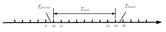 The peak time of off-duty travel of private EVs is typically 17:00–19:00 []. Assuming that the starting charge time is the last return time of the trip, combined with the survey results of the United States Department of Transportation on American household vehicles, the final return time of the vehicle is a normal distribution. In Equation (3), t is the final return time of the vehicle, and its probability density function is as follows: