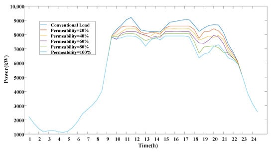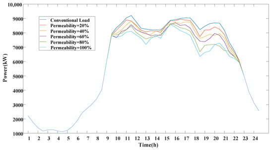 The scale of Group C is large, so the permeability of EVs is an important factor affecting the efficiency of the strategy. We assuming that the length of the RI is set to be 30 min, and we change the different permeabilities for Group C. When there is no group A and group B involved in the regulation, the impact of EVs participating in UC load regulation with different peak load permeabilities is shown in Figure 14. It can be observed from the figure that peak load decreases with the increase of permeability of EVs. EVs in Group C can relieve the peak load pressure. However, group C loads cannot be regulated. As shown in Figure 14, load reduction is obvious in the evening when the parking time of group C is concentrated. However, the effect of load regulation is poor at noon when the number of vehicles in group C is small. It is the reason why peak load decreases about to 9.43% when the permeability reaches 100%.