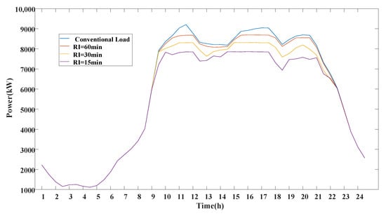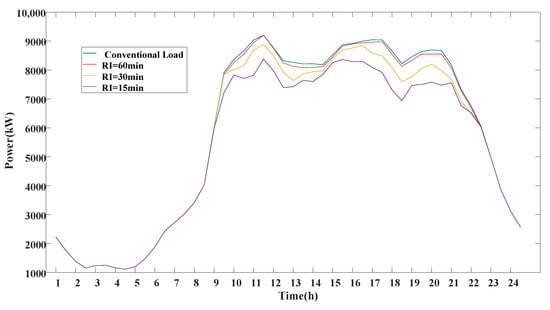 Assuming that the permeability of Group C is 40%, we set the RI as 15, 30 and 60 min, and explore the influence of different interval lengths when only group C EVs participate in load balancing. The simulation results are shown in Figure 16. When the RI is too long (60 min), the number of EVs that can satisfy the RI is very small, and it has little effect on load regulation. When the regulation time is shortened to 15 min, load regulation strategy works well. The peak load decreases about 9.44%, which is same as the situation (RI = 30 min, permeability = 40%, without Group A and B EVs). The shorter interval makes more EVs participate in the discharge, so that more electricity from Group C EVs can participate in the regulation.