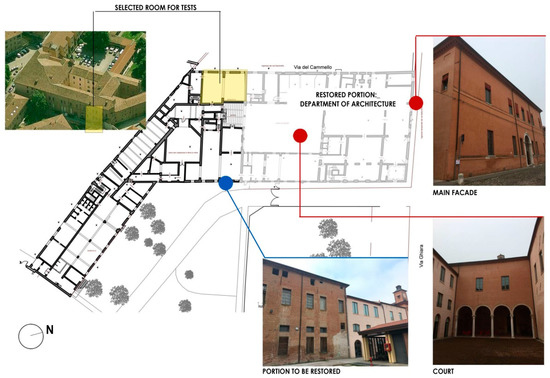 The in situ test was being performed in Palazzo Tassoni Estense in Ferrara, Italy. This 15th century listed building is part of a UNESCO site [86], with characteristics representative of many historic buildings. Since 1997, the Palazzo has been the subject of several studies, which resulted in an architecture project and a scientific restoration intervention [87]. The complex of the Palace is located in the NW part of a block, currently housing almost exclusively the Department of Architecture of the University of Ferrara, near the ancient walls of the city.