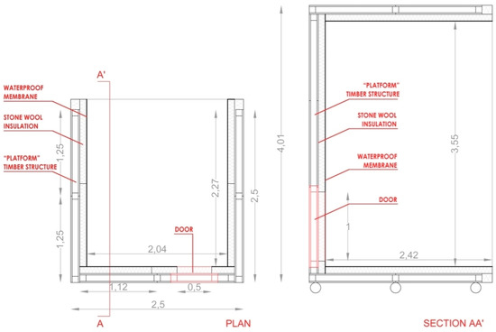 One of the common characteristics of most metering boxes is their mobile base design. Anticipating future studies on different case studies, risks on the selected room where the monitoring campaign was initially foreseen, or given its own weight (≈700 kg), alike in [92], the newly developed metering box was intentionally provided with wheels thus that it could be more easily moved. Moreover, it was built of a modular timber structure to be more simply dismantled or size adjusted in the event it had to be moved to another room or building with other specifications. This feature, i.e., the box possibility of re-assemblage and re-usability, emphasized the experiment’s sustainability.