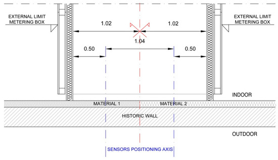 Box dimensions were determined not only by the anticipated study of probable vertical heat stratification common in historic buildings often with high ceilings (see also Section 5.1), but also due to the favoured and anticipated study of at least 2 insulation systems put in parallel, as depicted in Figure 4, alike the experimental study developed by Kloseiko et al. [93]. In [93], the hygrothermal performance of an internally insulated brick wall was studied, with different insulation systems, measuring 1.00 m width each (this way, by placing sensors in the middle, a 0.50 m distance from each material border was assured).