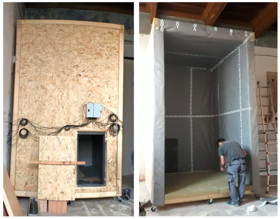 One of the main objectives of the HeLLo project, besides the general scientific final goal to make actors of buildings sector aware of strengths and weaknesses of the most common energy retrofit technical solutions when applied to historic buildings [32], was the development of a very wide and structured program of dissemination The idea was to open the door of the laboratory to other different stakeholders and involve them in the project activities. Among this open Labs program, in the one called SchoolLab activity, in a unique didactical approach, students of the 2nd year of the Degree of Architecture were involved in the activity of the box constructing—Figure A1 in Appendix A unveils some of the steps of the box construction. During this phase, only the ‘outer-shell’ was executed (the platform frame structure), being later internally coated with 10 cm high-density stone wool, covered by a vapor barrier, Figure 5.