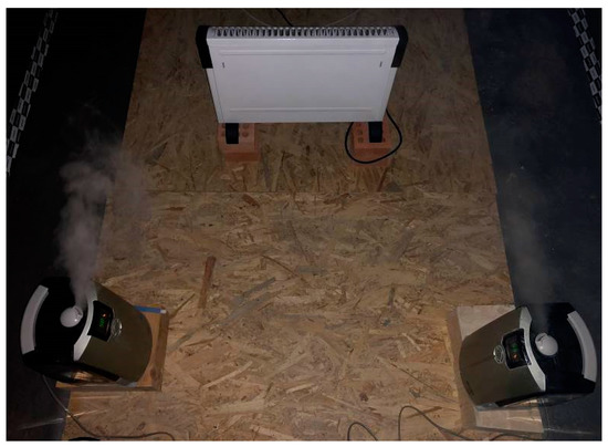 The metering box was provided with a 2000 W heating convector (with 3 power levels), locally controlled by its own sensor (PID, as described below) and 2 ultrasonic humidifiers, (argo HYDRO digit), 30W/each, self-regulated, which guaranteed indoor air parameters at the desired setup conditions (T ≈ 20 °C, RH ≈ 55%), Figure 6.