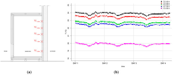 A simple test was performed to control vertical heat stratification inside the box. Five hand-made thermocouples (TC) with an accuracy of 0.5 °C (calibrated in the laboratory), were placed on the surface of the historic wall, between 0.90 m and 3.40 m from the floor to circa 0.50 m from the box boundaries (Figure 7a), during a four-day monitoring period. As shown in Figure 7b, between the highest TC (h = 3.40 m, in black) and the lowest one (h = 0.90 m, in pink) there was an average difference of 4 °C. This simple test has confirmed the anticipated heat stratification, common in historic buildings, justifying the height of the box.