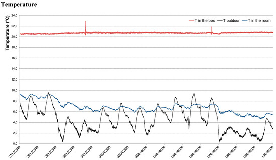 As shown in Figure 9, the outdoor climate in this winter period is quite varied. The same goes for the conditions of the room where the box is placed, which, as expected, were close to the outdoor conditions, less the thermal influence of the inertia of the historic building envelope. For the entire monitoring period (27 December 2019–10 January 2020), the conditions in the box were definitely stable, average T = 20.7 °C, average RH = 56.5%.