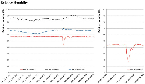 As declared, the door of the box was opened twice during this period, on the 30 December 2019 and 6 January 2020, i.e., the experiment might need to be controlled on-site up to once a week. Nonetheless, this action interferes with almost nothing with the continuity and stability of the indoor conditions. Looking at the most noticeable peak, registered on the 30th December, Figure 10, from the moment the door was opened, the indoor temperature suffered a maximum variation of 2.7 °C. Likewise, RH ∆max = 15%.