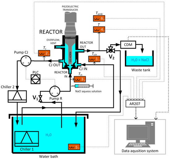 The complete measuring setup is shown in Figure 1. The main element of the measuring setup is the continuous flow sonoreactor (REACTOR) with a cooling jacket (CJ) adapted to work with the Branson 450 sonifier (maximal input electric power 350 W, ultrasonic frequency 20 kHz). The ultrasonic power is pulsed (frequency: 1 Hz) and can be controlled manually by changing its duty cycle. The ultrasonic horn with diameter ½″ (US HORN) is attached to the reactor via a screw connection. The jacketed sonoreactor has three connections to the reaction vessel (volume about 36 mL) and two connections to the cooling jacket (volume about 5 mL). The topmost connection of the reaction vessel is used to vent the reactor and the other connections are used as input and output for reagents. The sonoreactor has two circuits: the cooling circuit through the cooling jacket with the input “CJ IN” and the output “CJ OUT”, and the main circuit through the reaction vessel (REACTOR) with the input “REACTOR IN” and the output “REACTOR OUT” (Figure 1). All the temperature values, including input and output temperatures in each circuit and ambient temperature, are measured by using PT100 sensors connected to the multi-channel temperature data logger (APAR, model AR207; sampling period: 1 s). The flow rates in both circuits are controlled by using peristaltic pumps (Masterflex, model no. 77521-57) and the programmable logic controller (Allen Bradley, Compact Logix).