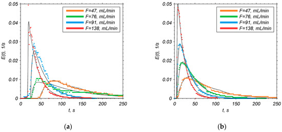 The experimentally determined E(t) curves clearly show that the measured responses are delayed in time and the delay time is strictly dependent on the flow rate F. Then, one can observe a high rise of the tracer concentration (conductivity), followed by its exponential decay with a rate that is also dependent on the flow rate F. Hence, the mixing pattern in the reactor vessel can be approximated by using the first order system with a delay [22,23]: