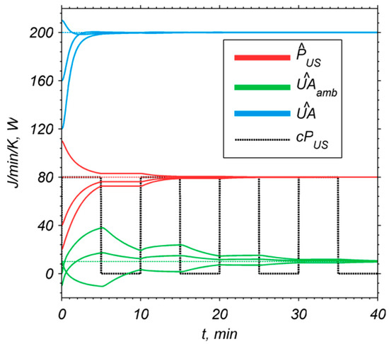 The estimation of the vector of unknown parameters θ can be performed on-line by numerical integration of Equations (6) and (7) at each sampling time instant tn = nTs, where Ts is the sampling time. If the sampling time Ts is sufficiently small (to ensure numerical stability), then for given initial values of and , Equations (6) and (7) can be solved by using the explicit Euler’s method. For example, let PUS = 80 W, UA = 200 J/min/K, and UAamb = 10 J/min/K be true parameter values for system (3) and (4). Then, from (13) for Q = 20KI2 and AF = –10I2, one gets P = KI2, where I2 is 2 × 2 identity matrix and K > 0 is the observer gain. Figure 3 shows time courses of estimates , , and for numerically simulated system (3) and (4) with Λ = diag(200,1,0.1) and K = 500. The ultrasonic power c(t)PUS is switched on and off between 0 and 80 W with a period Tp = 10 min.