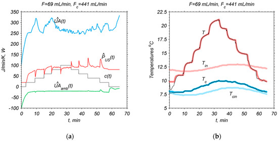 Figure 4b and Figure 5b show the corresponding simulation results for model (3) and (4) by substituting the estimates , , and into unknown model parameters PUS, UAamb, and UA, respectively. The model Equations (3) and (4) are solved on-line by using explicit Euler’s method and the vector of estimates updated by the observer (6) and (7) every sampling period Ts.