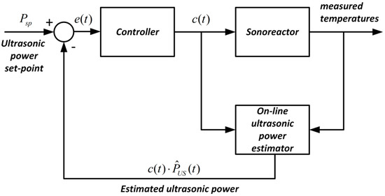 By using the observer Equations (6) and (7), the ultrasonic power can be easily monitored on-line in the pulse mode. Then, it is possible to design a controller that stabilizes the estimated ultrasonic power at the desired level Psp, also in the presence of disturbances. A possible structure of the control system is shown in Figure 6. The observer estimates the ultrasonic power and the controller manipulates the duty cycle c(t) to minimize the control error e(t), i.e., the difference between the setpoint Psp and the estimated ultrasonic power . Since there is a very good agreement between the measured temperatures and the model (3) and (4) predictions, advanced control algorithms (e.g., model-based controllers [28,29]) can also be considered. However, in this case, for the proposed estimation method, we must also ensure that the control signal c(t) is sufficiently exciting. This problem will be explored in our future studies.