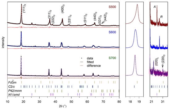 Figure 1 illustrates the comparison of the XRD patterns of three samples. As can be seen, with increasing synthesis temperature, the full-width at half-maximum peaks decreased, indicating an increase in particle size. The pattern of LiMn2O4, PDF# 35-0782 (dcell = 8.2472) standard with the cubic spinel structure and space group of Fd3m, was used to index these peaks. The S500 exhibited an impurity phase of anatase (A, peak located at 2θ = 25.2°) and rutile (R, a peak located at 2θ = 27.4°) TiO2, which was similar to the results reported in Ref. []. The anatase phase transforms into the rutile phase at 600 °C. Therefore, in the S600 sample, only the peak of the rutile phase was present. The low synthesis temperature did not provide sufficient energy to complete the reaction. At this temperature, if the amount of Li was increased, the reaction would be completed with no impurity phase of rutile and with an increase in the layered content in the composite [,,]. For the S700 sample, no impurity phase was observed. All peaks could be indexed with LiMn2O4 and the space group of Fd3m. From the selected region, the strongest peaks of the (111) plane in the S500 and S600 samples shifted to a higher angle, caused by the formation of the spinel phase of Li1+xMn2−x−yTiyO4. With increasing synthesis temperature, this phase decomposed to the spinel LiMnTiO4 and layered Li2Mn0.5Ti0.5O3, which is similar to Li2TiO3 []. This reaction can be defined using the following equations: