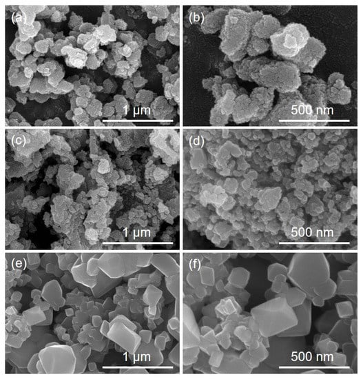 Figure 2 depicts the SEM images of the three samples. It was apparent that S500 exhibited the smallest particle size (Figure S1). The particles grew larger with increasing synthesis temperature. The primary nanoparticles in the S500 and S600 samples aggregated into secondary particles as a result of their large surface areas (Figure 2b,d). The S700 sample exhibited particle sizes of 100–300 nm. In the S700 sample, the octahedral shape of the particles was clear. This indicates the high crystallinity of this sample, consistent with the XRD data. The particle size and the crystallinity both affected the electrochemical performance of the cathode; the former enhanced the rate ability, whereas the latter enhanced the capacity and cycling stability.