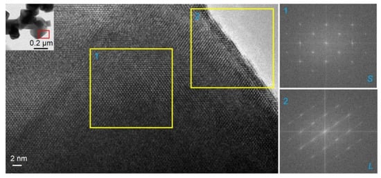 We further analyzed the S700 sample using HRTEM because it had no impurity phase of TiO2 The results were shown in Figure 3. The lattice fringe spacing was determined to be 0.487 nm, which belonged to the (111) plane of the spinel phase or the (002) plane of the layered phase. The composite structure was clear in the marked region. Moreover, the FFT of the selected region confirmed the co-existence of the spinel and layered phases.