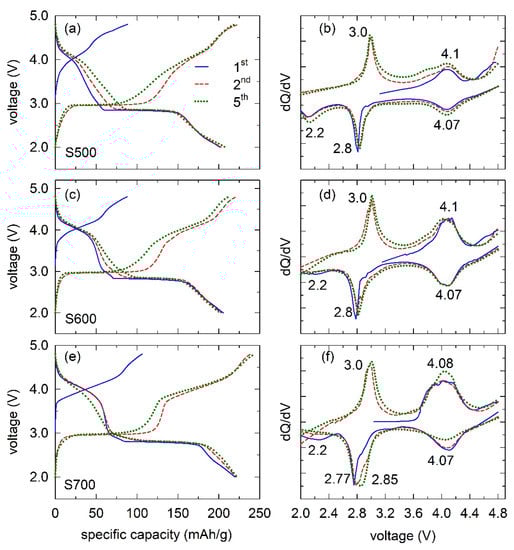 Voltage profiles and corresponding dQ/dV plots of (a,b) S500, (c,d) S600, and (e,f) S700 at C/10 in the 2.0–4.8 V voltage window for the 1st, 2nd, and 5th cycles.