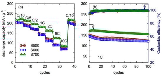 (a) Cycling stability curves at different C-rates and at (b) 1C for the S500, S600, and S700 samples.