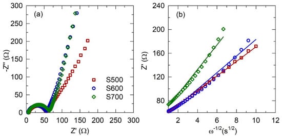 (a) EIS and (b) real parts of the complex impedance versus ω−1/2 for S500, S600, and S700 before cycling.