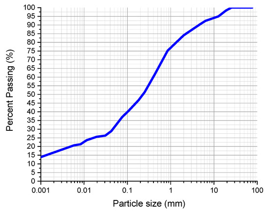 Table 1 and Figure 1 summarise the characteristics of the soil used for CEBs production. The soil presented a good particle size distribution and showed the four types of particles in significant percentages (15.9% pebble, 47.2% sand, 17.6% silt, and 19.4% clay). As shown in Table 1, the soil has a liquid limit of 29% and a plasticity index of 11%. Therefore, it can be classified as a fair to poor clayed soil (type A6) according to the American Association of State Highway Transportation Officials (AASHTO) system [32]. However, according to the CRATerre group [33], these figures are within the limits of the recommended classes for soil to be used as a construction material. The methylene blue test shows 2.28 g of methylene blue per 100 g of soil, indicating a low degree of expansion, as also confirmed by the plasticity index, suggesting a low clay content in the studied soil [34]. This result is good since expansive soils are affected by humidity variations that change its consistency [35]. The analysed soil has a maximum dry density between 1.95 g/cm3 and 1.99 g/cm3, which means that this soil is classified as “very good” to be used as construction material [33].