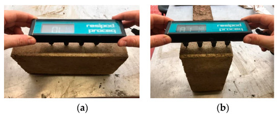 The electrical resistivity was measured using the ResipodProceq equipment, made by Proceq SA (Schwerzenbach, Switzerland), which comprises four equidistant (38 mm) electrodes (Figure 2). During this test, an alternate current was provided between the external electrodes and the electrical potential difference between the internal electrodes was measured. The electrical resistivity was measured through the Ohm’s law and computed by the equipment used. The tested samples were the ones used for the water absorption by capillarity test after they achieved the saturation point. Four measurements were done for each saturated compressed earth block sample.