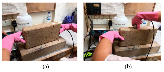 The Ultrasonic Pulse Velocity (UPV) test evaluates some materials properties, such as elasticity modulus, homogeneity, mechanical resistances, and cracking. It is also possible to calculate the propagation velocity [36]. The UPV tests consists of measuring the time that a given sound pulse takes to pass through a known section of a specimen. This is based on the wave propagation theory, where a sound pulse propagates faster in a dense material and slowly in a porous material. It is therefore possible to calculate the propagation velocity [36], and this test allows the indirect determination of the intrinsic characteristics of a given sample [36]. There is almost nothing in the literature about the use of this test in compressed earth blocks. Nevertheless, there are some studies that have already been performed on rammed earth [37,38] that disclose that there is a relation between the UPV and the compressive strength of earthen products. The UPV measurement was developed according to EN 12504-4:2007 [39] in two directions (direct and indirect—see Figure 3). The measure of UPV in the direct position was obtained with the transmitter and receiver transducers positioned on two opposite sides. The indirect measurements were done by placing the transmitter on one face and the receiver on a perpendicular side. An appropriate coupling gel was applied between the transducers and the sample to prevent the existence of voids in the contact area. Three independent readings were registered for each sample. Equation (1) is used to calculate the UPV, which is the ratio between the distance (L) between the transductors (emission and receptor) and the propagation time (t).