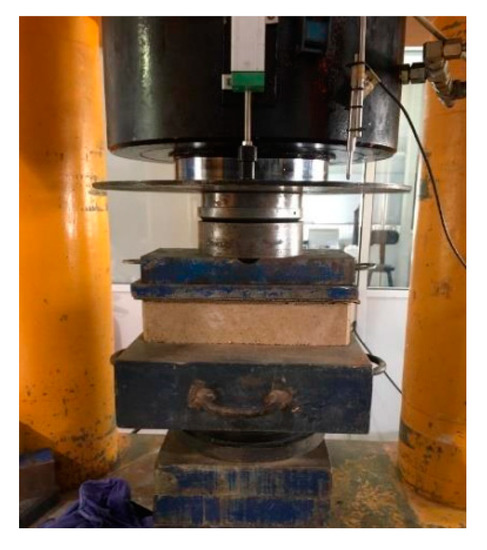The compressive strength test used a hydraulic press machine with a capacity of 3000 kN (Figure 4), coupled with a hydraulic control system, according to NP EN 772-1 [40]. For the test, two transducers were used, one that belongs to the press and another external to measure the vertical displacement (LVSTs). The test used displacement control, with a regular load velocity of 0.5 kN/s. The experiment consisted of applying an increasing compressive load until the load achieved 40% to 50% of the failure value after registering the maximum load peak. Six samples were tested to assess the compressive strength of CEBs.