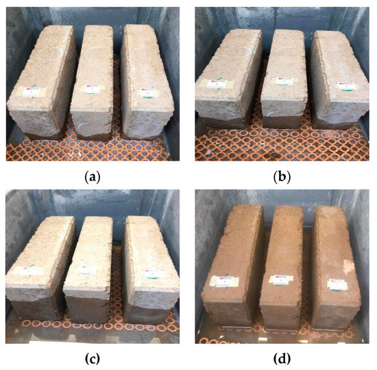 Water absorption by capillarity test: (a) after 10 min of water immersion; (b) after 30 min of water immersion; (c) after 45 min of water immersion; and (d) after 60 min of water immersion.