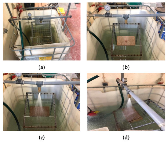 This test analyses the degradation process of a specimen caused by water falling on it. This experiment verifies the surface resistance to erosion, thus evaluating the durability of the analysed blocks. The test was performed according to NZS 4298:1998 [39], and a rain simulator was used (Figure 6). The climate parameters used were the ones for Penhas Douradas region, Guarda district since it is the Portuguese region with the highest precipitation values (1715 mm). In the experiment, a direct rainfall exposure index (worst scenario) was considered, which means that a flow rate of 14.26 L/min was used in the rainfall simulation. The outlet pressure in the water nozzle was 45 kPa, respecting the conditions recommended for erosion tests in the international standards.