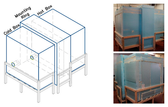 The characterisation of the thermal properties of the CEBs is based on the analysis of the thermal transmittance (U-value) of the product. The thermal transmittance was measured using a guarded hot box set up apparatus, built for this study in the Department of Civil Engineering of the University of Minho, according to ASTM C1363-11:2011 [45] (Figure 7a). The hot box consists of two five-sided chambers (dimensions: 2.0 m × 1.4 m × 1.6 m), the cold and the hot one. The envelope is well insulated, made of extruded polystyrene (20 cm; U = 0.21 W/(m2·K)), to reduce the heat flux through the envelope and minimise heat losses by conduction. The specimen is placed in the mounting ring placed between the two chambers (Figure 7b). The setup is placed in an indoor environment with a controlled temperature below to the ones in the measurement chambers.