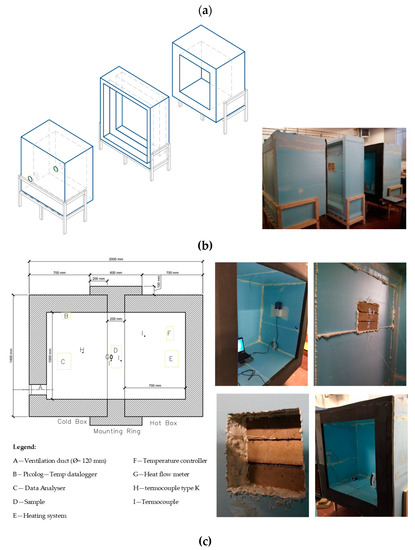 Hot box apparatus. Legend: (a) hotbox closed; (b) cold chamber, mounting ring, and hot chamber; (c) longitudinal plan view of the hotbox apparatus and position of the measurement equipment.