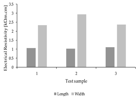 Electrical resistivity was measured to analyse the porosity of CEBs, and the results are presented in Figure 8. CEBs have electrical conductivity mainly because ions can propagate in their body. Electrical resistivity is directly dependent on CEBs permeability. In water-saturated CEBs with higher porosity, the propagation of ions is easier, and therefore, there is a lower electrical resistivity [47]. From Figure 8, it is possible to conclude that the measurements done in the direction of the bigger dimension (length) of the sample showed similar results for all samples. However, in the measurements carried out in the other direction (width), sample 2 presented higher values than samples 1 and 3. This result can be an indication that sample 2 was denser, with fewer pores or with pores with smaller dimensions (meaning reduced permeability and conductibility). These outputs disclose some disparity between the porosity of tested CEB samples.