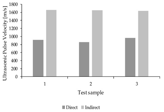 Figure 9 presents the results for the UPV for each sample, using the same samples used in the electrical resistivity test. Five measurements were carried out for every sample (for each direction, direct and indirect) and results presented in Figure 9 are the average of the results obtained for each sample.
