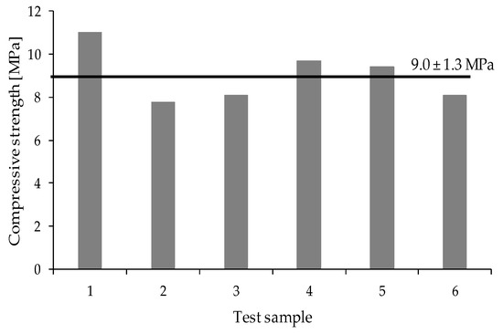 The compressive strength test is considered a reference test for CEBs since it is regarded as an essential indicator of masonry strength. Figure 10 presents the results obtained for the compressive strength of six samples, as well as the average value obtained for this parameter. The results showed a variation on compressive strength between 7.8 MPa and 11.0 MPa, being the average 9.0 ± 1.3 MPa. These values are very good ones since it is known that the minimum compressive strength requirements for CEBs, varying between 1.0 MPa and 2.8 MPa [7,21]. These higher values can be related to the compaction process used since compacting the soil using a press improves the quality of the material. The higher density obtained by compaction significantly increases the compressive strength of the blocks [48]. Another reason for the higher compressive strength is the presence of lime in the mixture. Lime allows the development of calcium silicate hydrate (CSH) together with the formation of minor amounts of calcite, which causes increased strength [21].