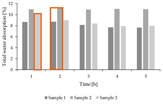Total water absorption results. The results highlighted by the orange box represents the maximum values obtained in the total water absorption test.