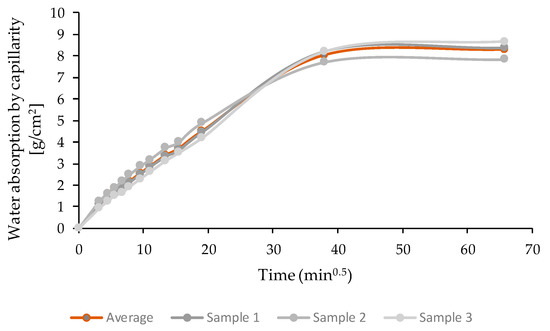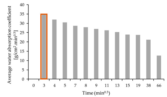CEBs used in a structure may undergo alternating phenomena of absorption and release of water, mainly because of the capillarity effect [49]. The curves shown in Figure 12 illustrate the variation of water absorption by capillarity until the total saturation of each sample is reached, as a function of the square root of test time. Figure 13 shows the variation of the water absorption coefficient (average of the three samples tested) of compressed earth blocks as a function of the square root of test time. This coefficient was determined for all test periods. However, the literature mentions that the value at the end of 10 min (represented with an orange rectangle in Figure 13) is representative of the behaviour of masonry exposed to a violent storm [21]. At the end of this period, the water absorption coefficient value was 34.6, and therefore, the blocks are classified as having high capillarity [21]. This result can be related to the fact that the soils used to manufacture the CEBs have a high percentage of sand (Table 1). In this study, the high presence of bigger particles (in terms of size) in CEBs seems to be an issue related with the quality of the particle size distribution of the soil, used for the CEBs production, than the quality of the soil itself, which did not cause good reaction with lime and resulted in CEBs with high porosity [10].