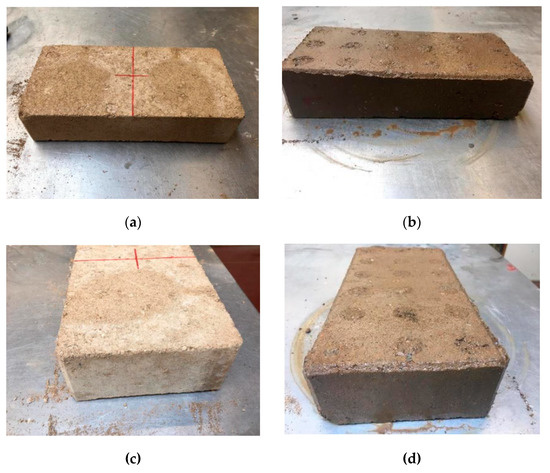 The degradation analysis of CEBs was done, and the results are presented in Figure 14, Figure 15 and Figure 16. A total of seven blocks were analysed in this test. Initially, three blocks were tested for one hour. Since blocks did not present any type of erosion, this test was repeated in four additional blocks, and the results were the same. Based on these results and according to NP EN 12504-4 [39], CEBs were classified with an erosion index of 1 (erosion depth between 0–20 mm/h), which means that they had very good results in terms of durability.