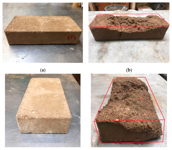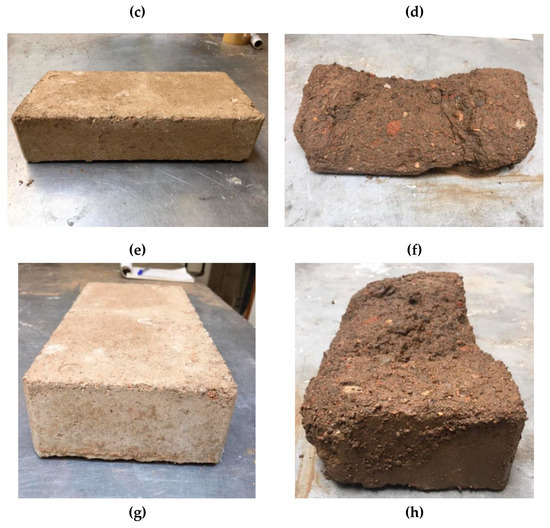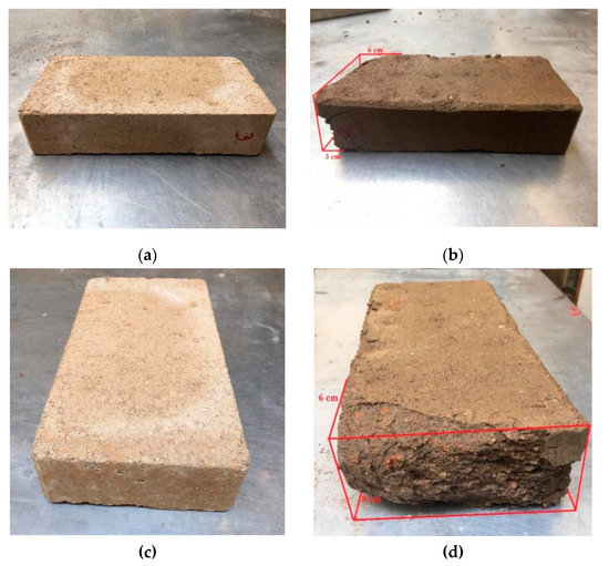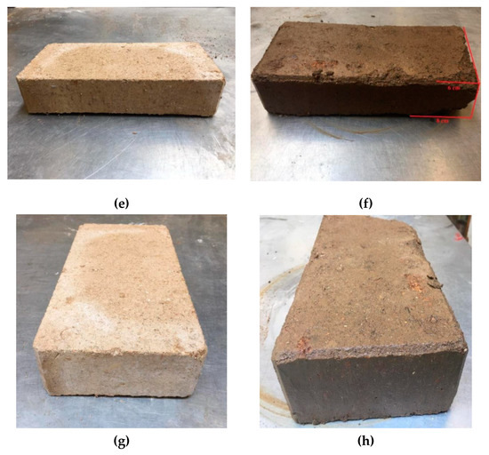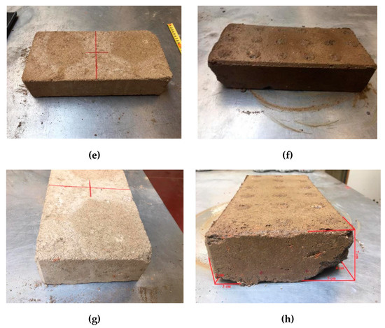 After two hours of water exposition, CEBs presented different behaviour. Sample 1 did not show significant damage in the majority of faces exposed to water but presented a loss in one part of the block where there was already a small defect before the test (Figure 14). Sample 2 showed similar behaviour to sample 1. Samples 3 (Figure 15), 4 and 5 presented some damage in the two smaller faces, even though the face in contact with the water was the one with a larger area (highlighted with a red cross in Figure 14). Samples 6 (Figure 16) and 7 suffered significant damage, and at the end of two hours, they were almost destroyed. It is then essential to analyse the reasoning behind the different deterioration levels of CEBs since they were manufactured using the same soil, mixture, and compaction process. The most probable explanation for the differences is the inadequate particle size distribution in the soil used. According to the literature in the field of earthen blocks, the soil should only present particles below 5 mm of diameter [48]. Nevertheless, it was possible to see particles with higher dimensions in the most damaged samples (Figure 16d,f,h). These big size particles affected the homogeneity of the mixture, which negatively influenced the porosity and the porous structure of the CEBs. The lack of uniformity in the structure of the blocks worsens their behaviour to water. This problem also explains the results achieved in the total water absorption and water absorption by capillarity tests. The presented porosity and durability issues can be minimised if proper soil preparation and/or selection is considered [18].