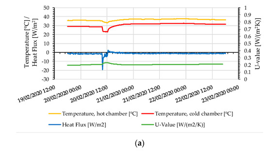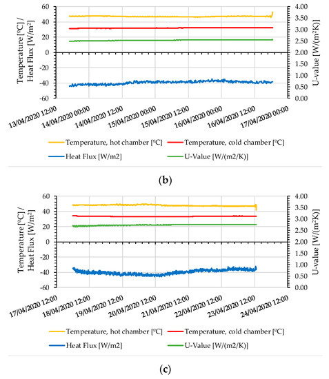 Regarding the thermal transmittance, Figure 17 shows the measurement results for the XPS wall (Figure 17a) and the compressed earth blocks small wall (Figure 17b,c). From the analysis of Figure 17, it is possible to verify that the values measured for temperature and the heat flux were very stable during the test period, in both cases. The temperature in the hot chamber practically did not change since the heat input to the box was controlled so that the temperature established was maintained (35 °C). The heating system turns on when the temperature drops below 35 °C and turns off when the temperature rises to 40 °C. The heat flux is presented as negative values due to heat flux sensor placement in the sample.