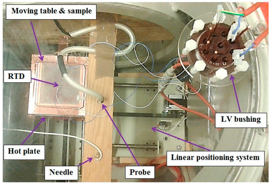 It is worth mentioning that before the SPD measurements at elevated temperatures were taken, the uniformity of thermal conditions in the sample was examined. Two resistive temperature detectors (RTD) were installed in the middle of the sample surface and at its edge. They were connected to a multimeter (Fluke 88464A) via bushing. The surface temperatures were recorded at different temperatures of the hot plate and at reduced pressure inside the chamber. The results of the measurements are provided in Table 2 and indicate that the temperature gradients through the thickness of the samples were insignificant and, therefore, their possible impact could be neglected.